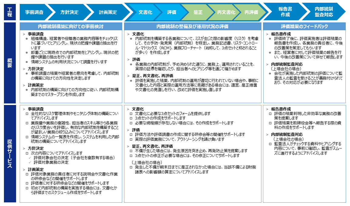 また、上場会社においては、財務報告に係る内部統制の評価は監査法人による内部統制監査の対象であり、新たに子会社等を取得した場合や事業規模が拡大した場合等においては、監査範囲が拡大します。そのような場合に、内部統制監査に先駆けて、公認会計士としての観点から重要と考えられる内部統制を確認し、必要であれば改善します。それにより、内部統制監査において不備が指摘されることを回避し、今後の監査コストの削減を図ることができるようにサポートします。